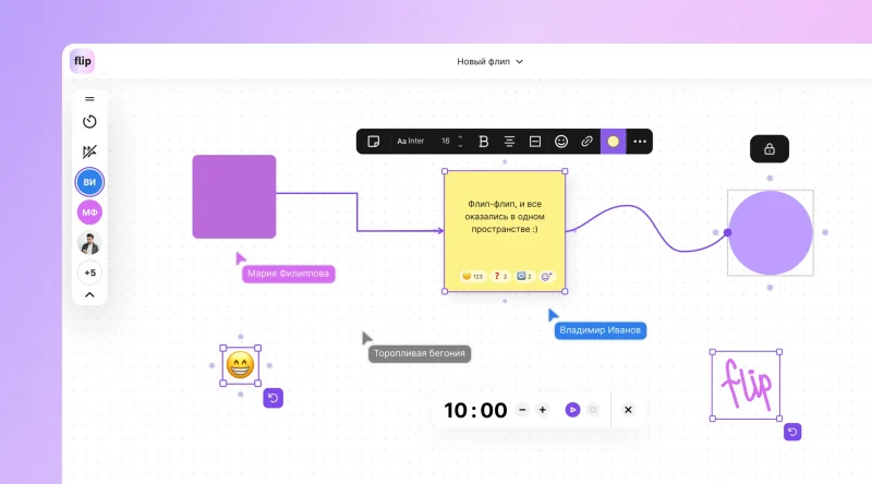 Современные технологии позволяют использовать интерактивные доски не только в физическом, но и в виртуальном пространстве. Онлайн-доски, такие как Flip, предоставляют пользователям возможность совместной работы в реальном времени из любой точки мира. Эти платформы оснащены инструментами для рисования, создания схем, добавления заметок и других визуальных элементов, что делает их незаменимыми для дистанционного обучения, удалённых совещаний и командной работы. Благодаря таким решениям команды могут эффективно взаимодействовать, обмениваться идеями и принимать решения, находясь на расстоянии друг от друга.