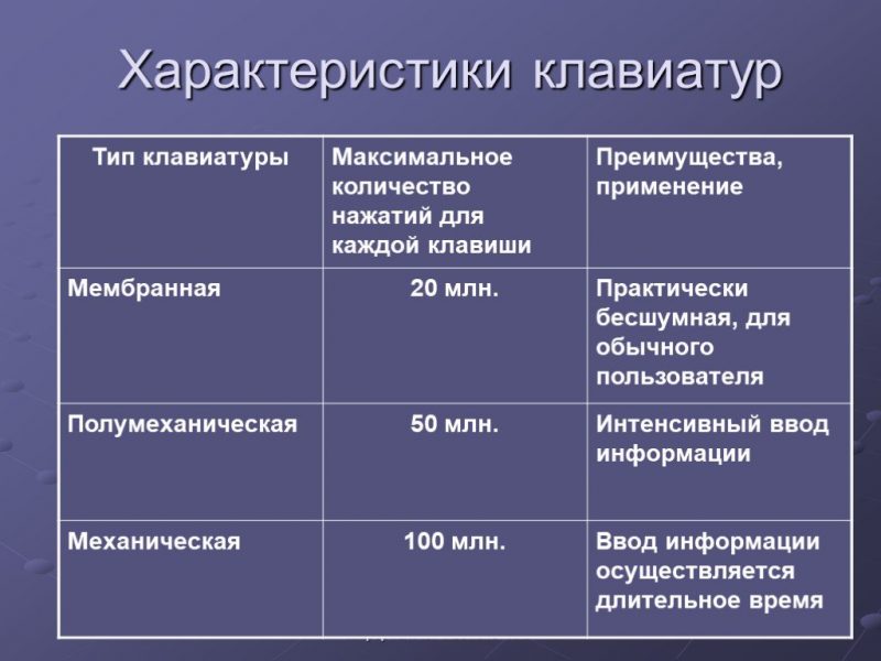Существует несколько основных типов клавиатур, которые различаются конструкцией, размерами и назначением.