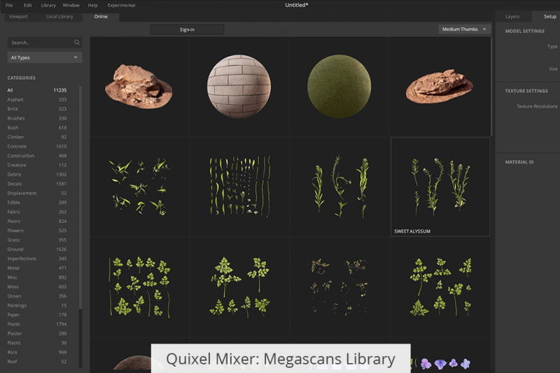 Quixel — это не просто разработчик Mixer, но и владелец библиотеки Megascans — одного из самых крупных и известных хранилищ сканов реальных материалов. Грунты, деревья, текстуры камня, кирпичей, песка, тканей — всё отсканировано в высоком разрешении и доступно для использования в проекте. Mixer позволяет использовать эти материалы напрямую, подбирая и настраивая их под себя.