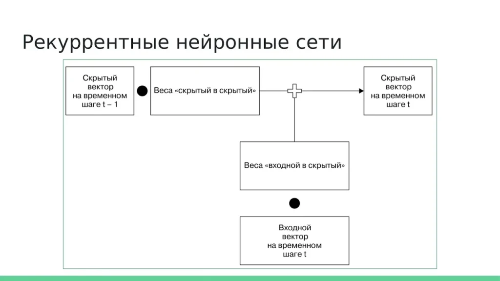 В отличие от feedforward- и сверточных сетей, которые обрабатывают все входные данные одновременно, рекуррентные нейронные сети (RNN) были разработаны с совершенно иной целью: работать с последовательностями. Их ключевая особенность — наличие внутреннего состояния (памяти), которое передается от одного шага последовательности к другому. Это позволяет RNN учитывать контекст: выход на текущем шаге зависит не только от текущего входа, но и от всей истории предыдущих входов. Такая архитектура делает их идеальными для задач, где порядок данных имеет критическое значение.