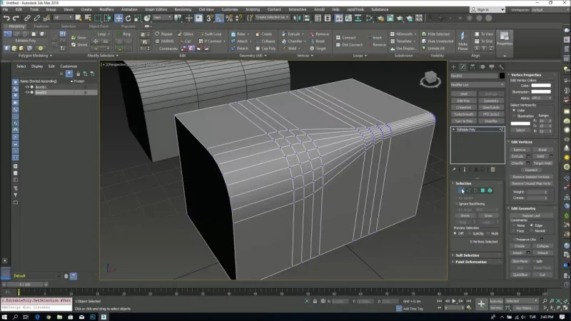 Для начала вам нужно преобразовать ваш объект в тип Editable Poly, чтобы иметь возможность редактировать его вершины, рёбра и грани. Для этого: