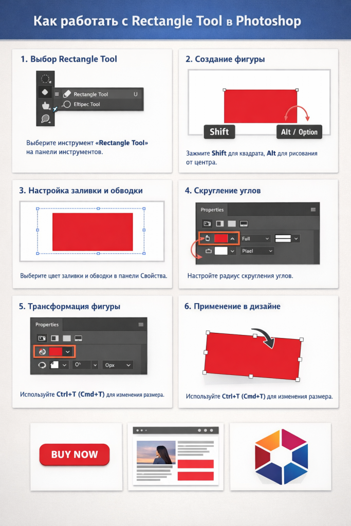 Инструмент Rectangle Tool — это один из основных инструментов в Adobe Photoshop, предназначенный для создания прямоугольных форм и элементов на холсте. Он является частью группы инструментов «Фигура» и позволяет как создавать простые прямоугольники и квадраты, так и работать с векторными или пиксельными объектами, которые могут служить базой для сложной графики, дизайна веб-элементов, иллюстраций и других визуальных проектов. Этот инструмент является неотъемлемой частью Photoshop — программного обеспечения, которое уже много лет считается стандартом в мире обработки и создания цифровых изображений. Основную информацию о назначении и базовой функциональности Rectangle Tool предоставляет официальная документация Adobe по работе с инструментами фигуры.